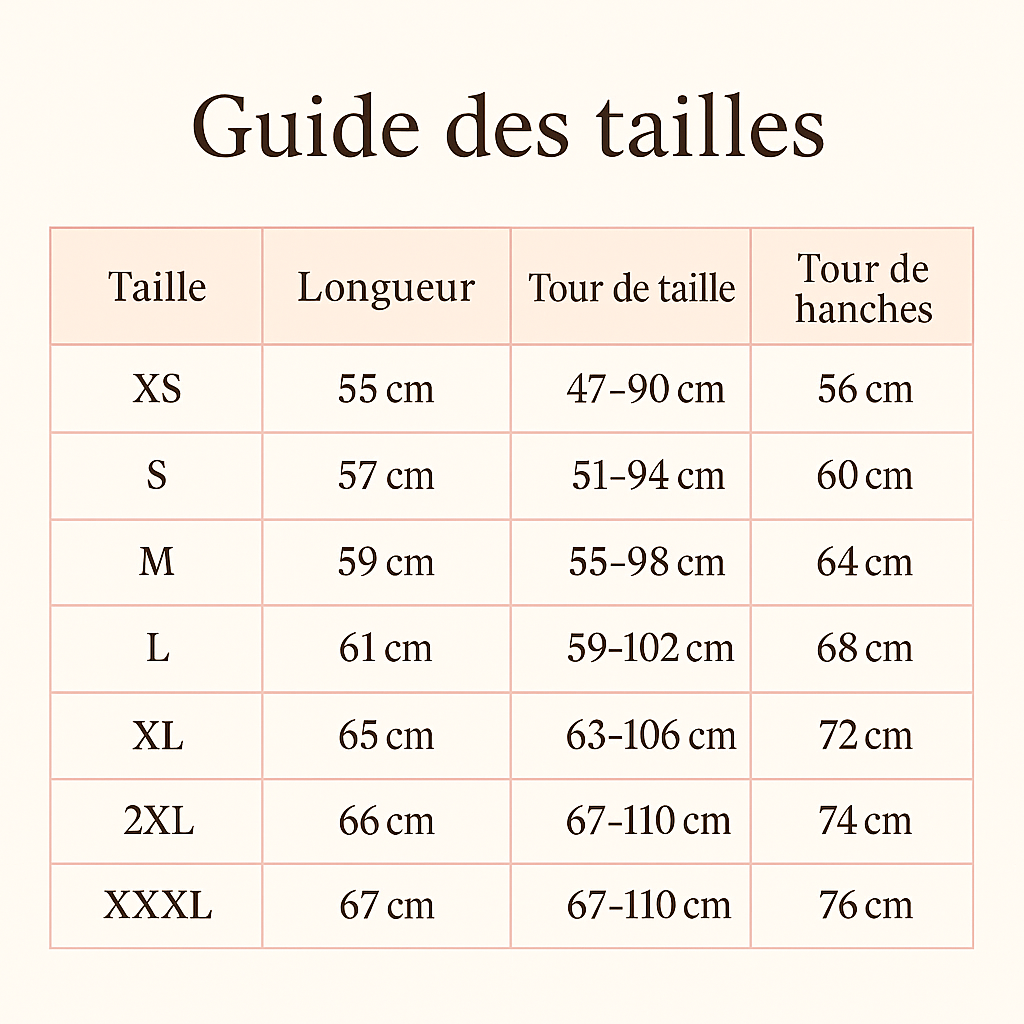 Un tableau de tailles est disponible sur notre site ll vous suffit de vous y fier pour trouver la vôtre. Le tissu s’ajuste ensuite à votre morphologie.